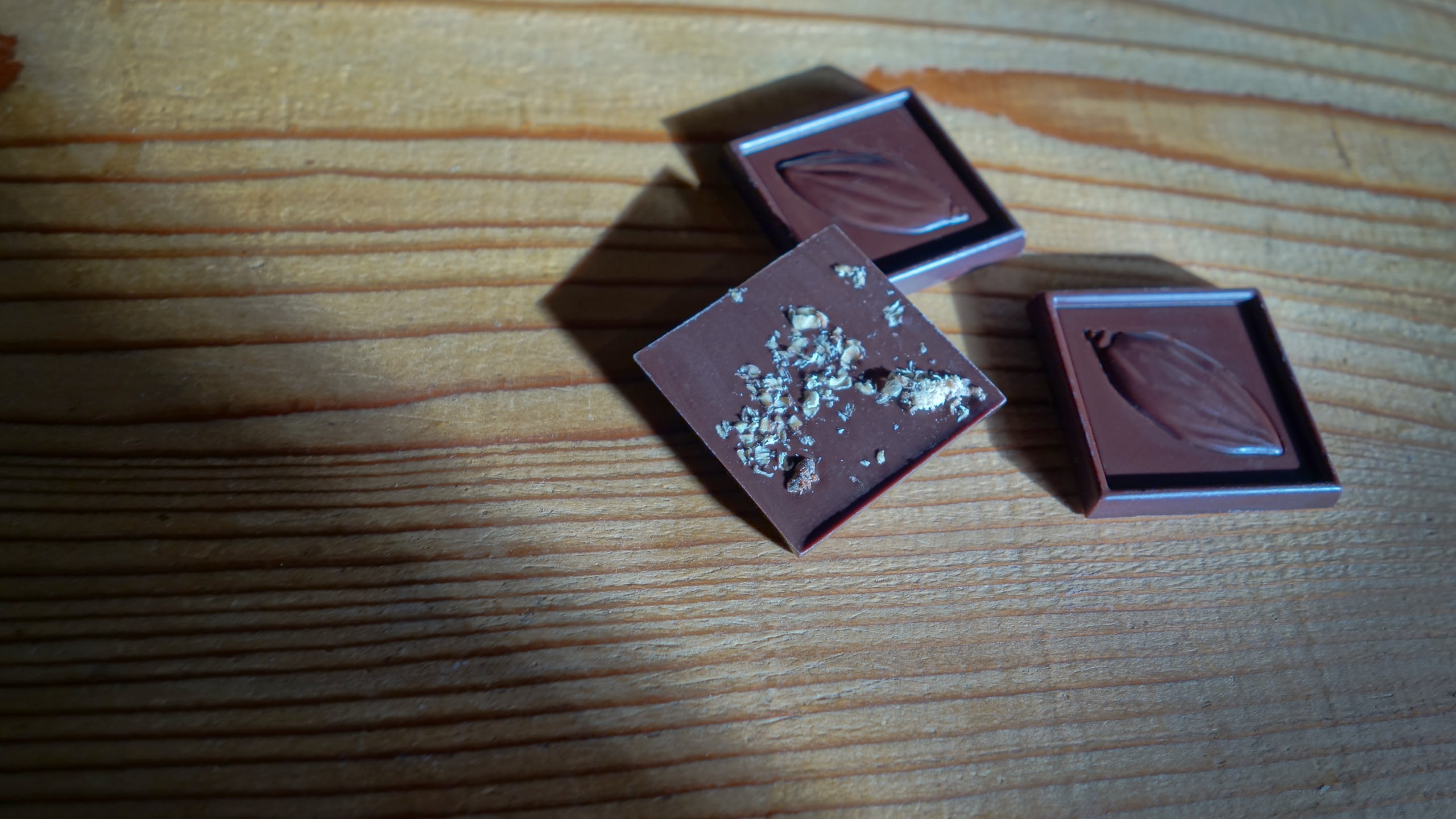 その穏やかな瀬戸内海の見た目からは想像できないほど、直島諸島の島と島の間が狭くなっているポイントは潮の流れが速く、そこで育った直島の魚やたこは身が引き締まってうま味も最高なのです。冬の島の寒気で一つ一つ丁寧に干した天然のたこの干物を、細かく粉砕し、チョコレートのテンパリング時に表面へ少量施しました。ぜひ海の恵みとカカオの邂逅をお楽しみ下さい。